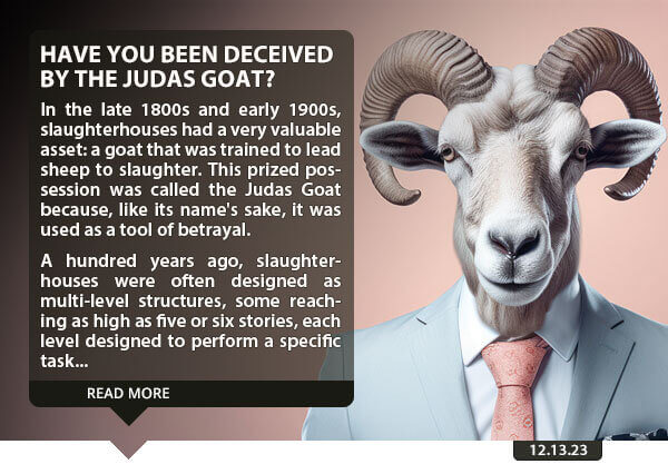 We live in a day where the world and, unfortunately, even the Church, has Judas goats leading people astray, marching them directly towards their own eternal demise. We have world leaders and some church leaders who are focused on deceiving the naïve and the innocent to gain personal wealth and privilege by leading the masses to slaughter.