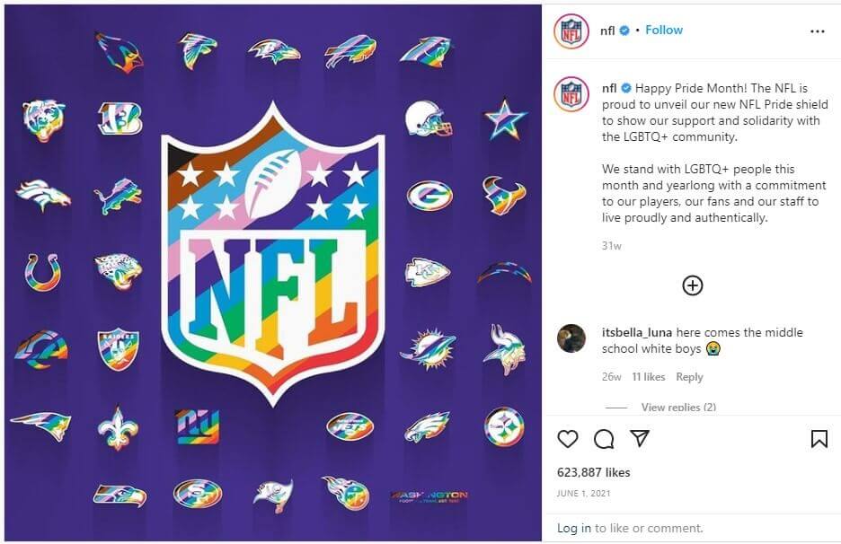 An NFL Instagram post went further and showed every team logo redecorated in the colors of the rainbow flag.