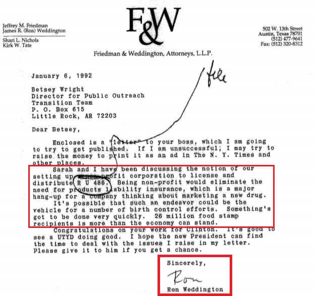 Ron Weddington letter about RU486 abortion pill to President Clinton cover page (Image: Judicial Watch)