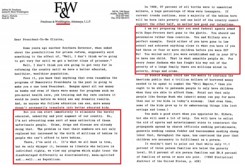 In 1992, Ron Weddington, a co-counsel of Roe v. Wade and the ex-husband of Roe attorney Sarah Weddington, wrote to the newly-elected Bill Clinton administration expressing concern about the growing size of certain population groups. His open letter, uncovered by Judicial Watch, recommended that the president should “eliminate” certain segments of society via vasectomies, tubal ligations, abortions, and the RU-486 abortion pill (emphasis added):