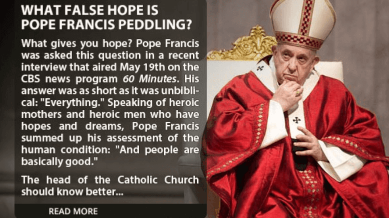 Pope Francis may peddle a false hope that was eagerly received by CBS reporter Norah O’Donnell, but Jesus Christ offers Himself as the Way, Truth, and Life that leads to eternal salvation. To cite the Apostle Paul once again, “Let God be found true, though every man be found a liar” (Romans 3:4).