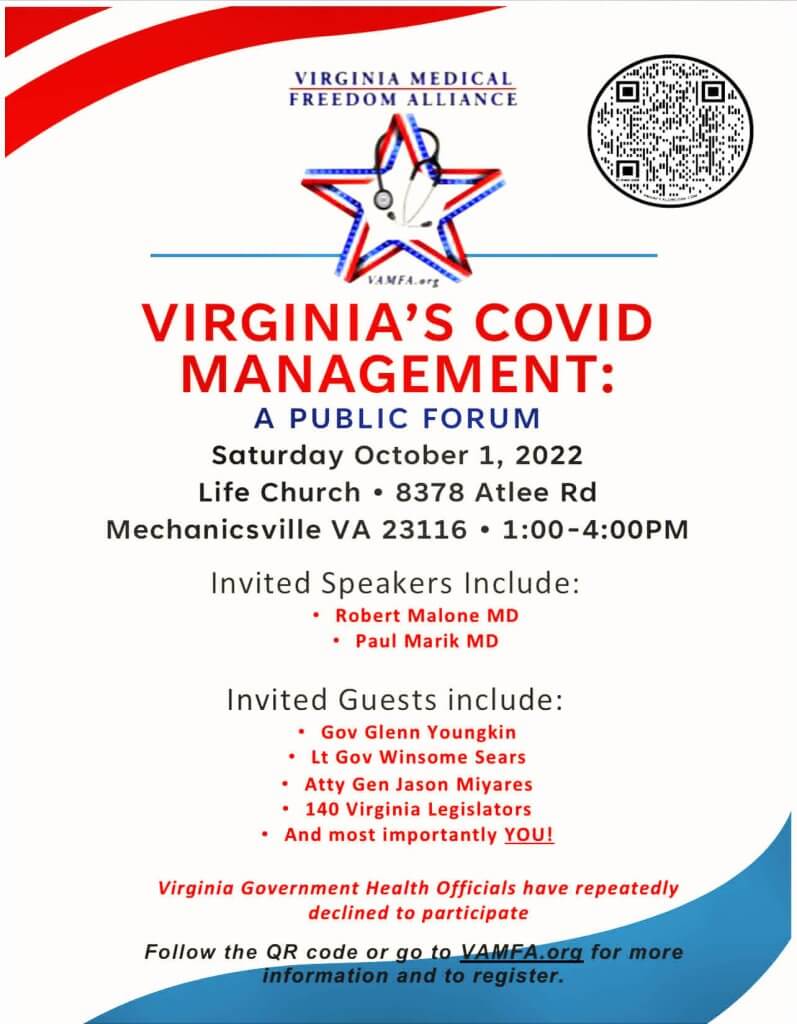 “The Virginia Medical Freedom Alliance (VAMFA) is sponsoring an open and uncensored public forum on October 1, 2022 about the public health system’s management of COVID in Virginia. Virginia government health officials have repeatedly declined requests from VAMFA to present the results of their COVID public health policies and treatments to date and have an open dialogue with Virginia doctors and medical scientists about alternative COVID prevention and treatment approaches. Thousands have died from COVID as a result of being denied access to life-saving early treatment and from injuries from the experimental genetic COVID shots.